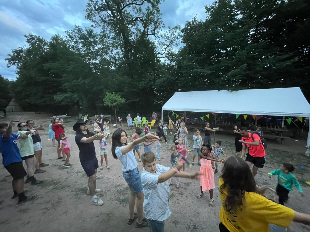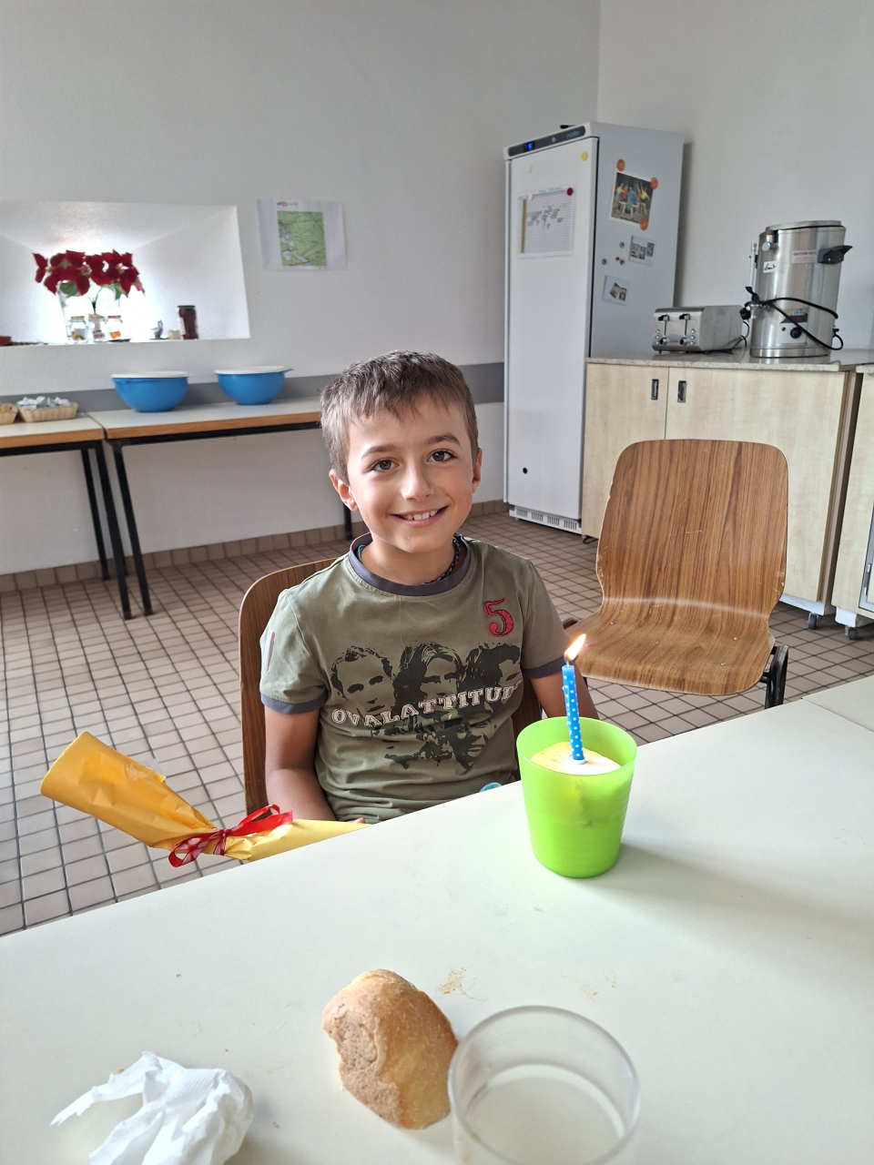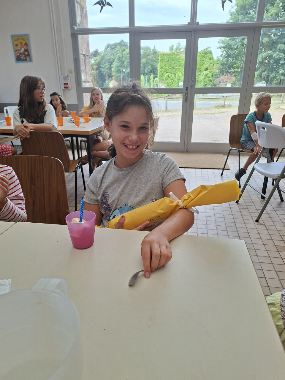 Après ces 4 activités, il est enfin temps d'aller manger : au menu, betteraves en entrée, lasagnes pour le plat principal et en dessert, de délicieuses îles flottantes. D'ailleurs, l'occasion était bienvenue pour célébrer l'anniversaire des indiens Maëva et Antonin avec en cadeau, de superbes t-shirt PATRO : bougies et rires à gogo !